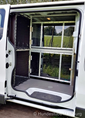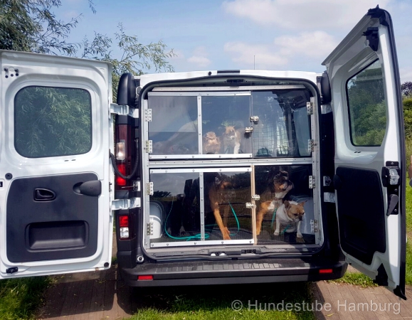 Die Konstruktion, die den Innenraum in mehrere großzügige Abteile aufteilt, hat eine Fachwerkstatt gebaut. Alle verwendeten, hochwertigen Materialien sind gekonnt verarbeitet und äußerst sicherheitsstabil. Nichts klappert oder ist wackelig. Die Böden sind mit speziellen, dicken Antirutschmatten verlegt, die den Hunden bestmöglichen Halt und zusätzliche Sicherheit bieten